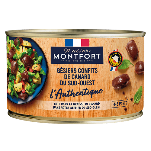 Des gésiers de canard préparés selon une recette traditionnelle et cuits dans la graisse de canard dans notre atelier du sud-ouest.