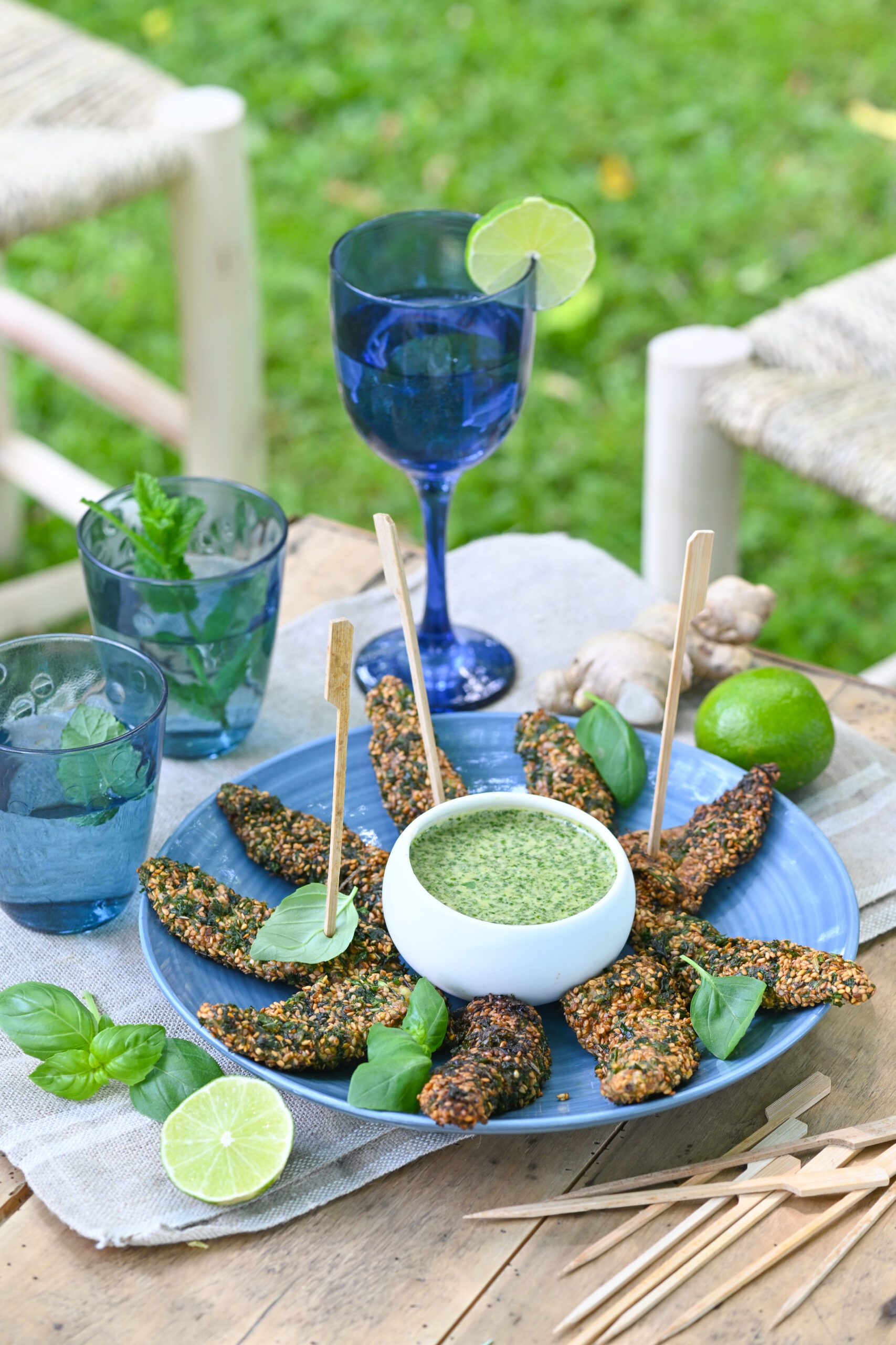 5.  Puis battez les jaunes d’œuf avec une cas d’eau et passez les aiguillettes dans l’œuf battu, panez-les ensuite dans le mélange d’herbes et de sésame