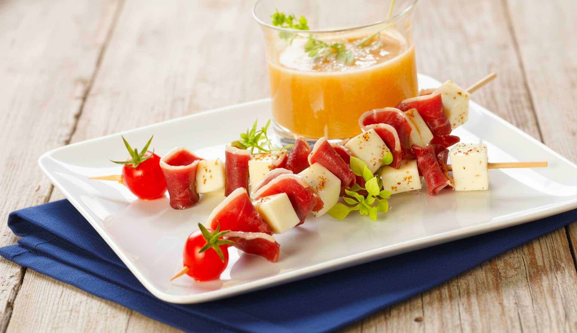 • 8. Piquer alternativement une tranche de magret séché pliée en deux et un cube de mozzarella, puis finir par une tomate cerise.