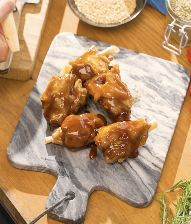 1.  Préparez la marinade dans un grand bol en mélangeant la sauce barbecue, le miel liquide, le sel et le poivre.