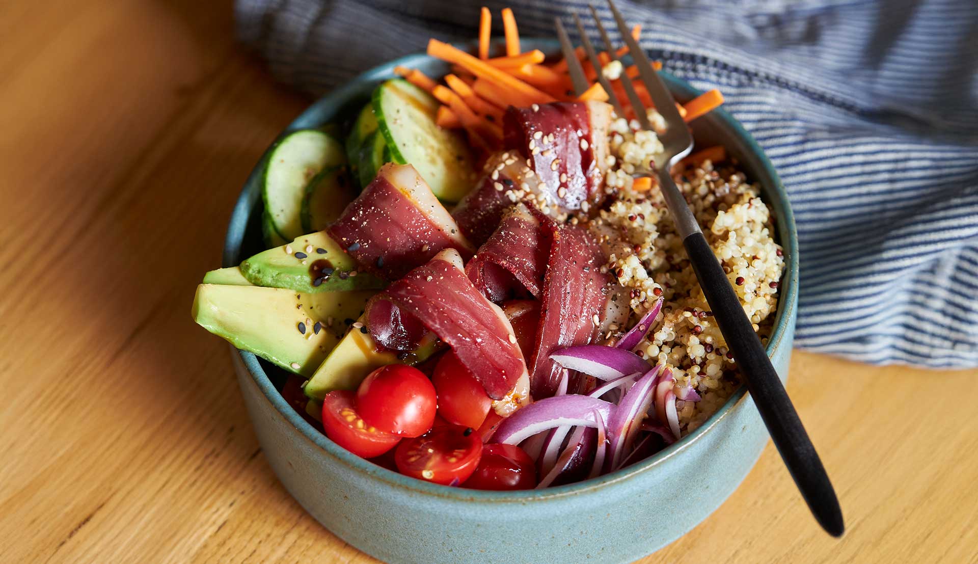 8.  Ajoutez le quinoa, les oignons, les tomates, le magret, l'avocat, le concombre et les carottes.
