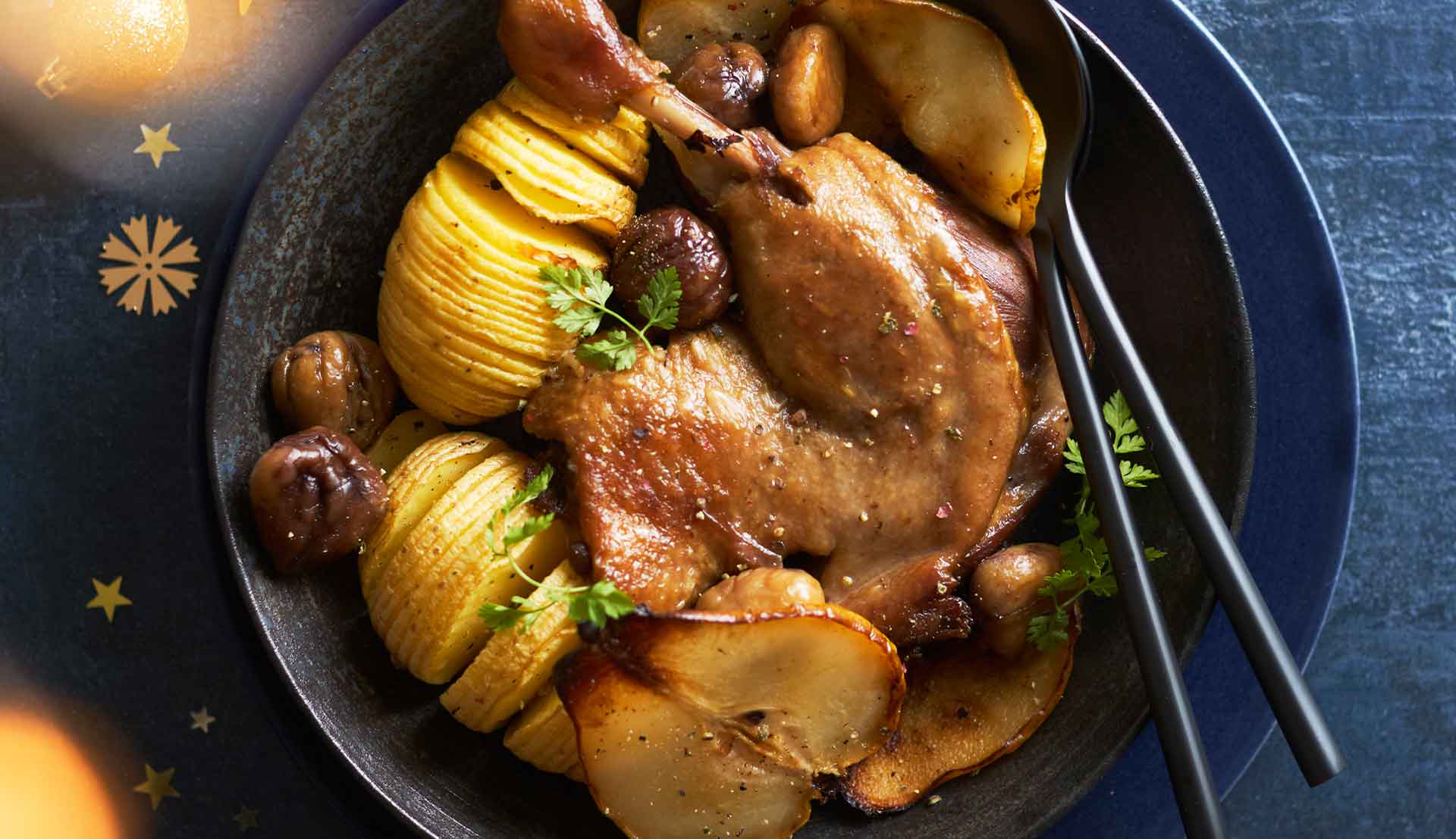 • 4. Dans un plat allant au four, disposez les pommes de terre, les châtaignes et les cuisses de canard.