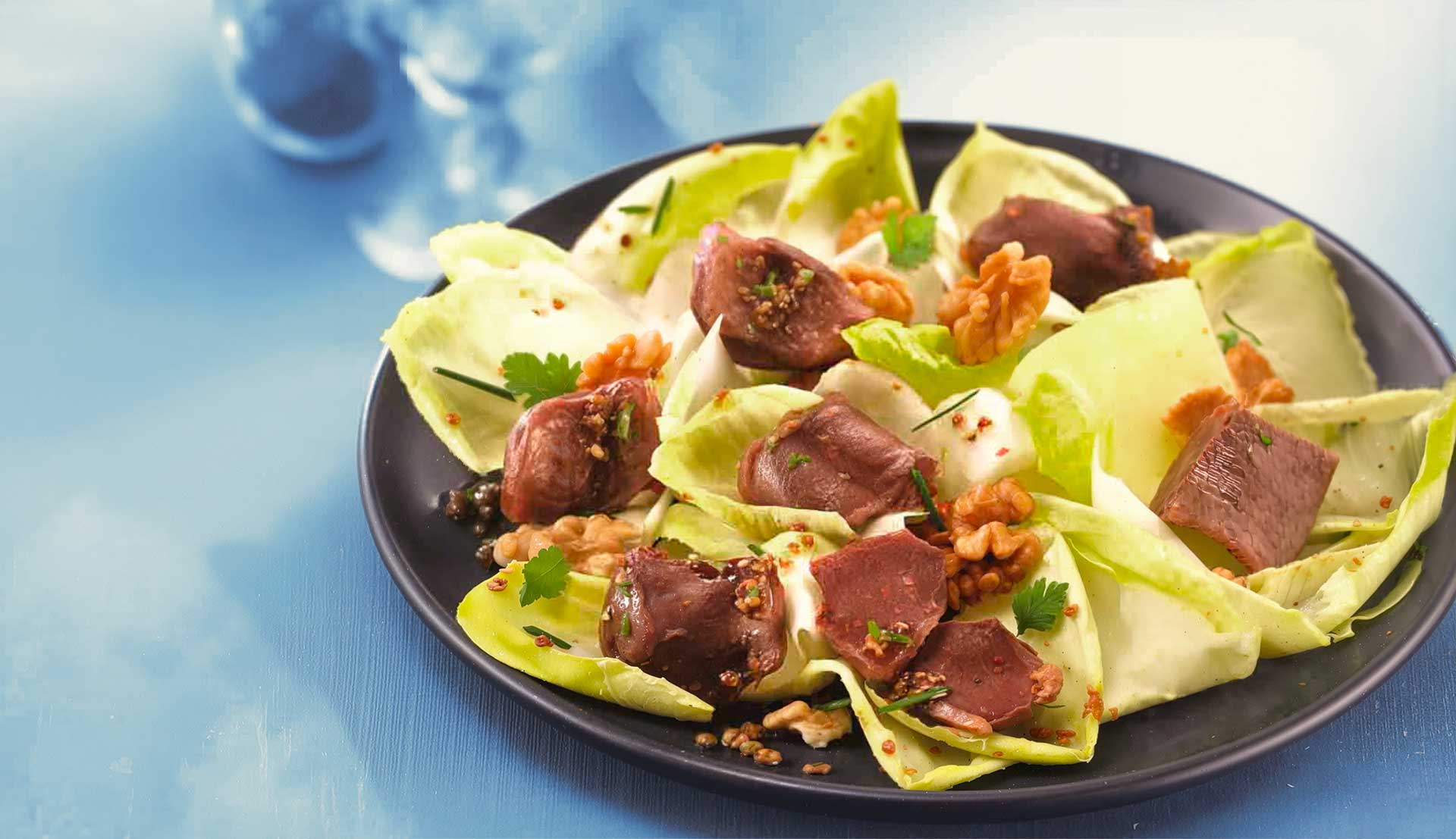 4. Disposez les gésiers confits tièdes sur les endives ainsi que 80gr de cerneaux de noix. Parsemez le tout avec quelques brins de cerfeuil et 1 cuillère à soupe de ciboulette ciselée.