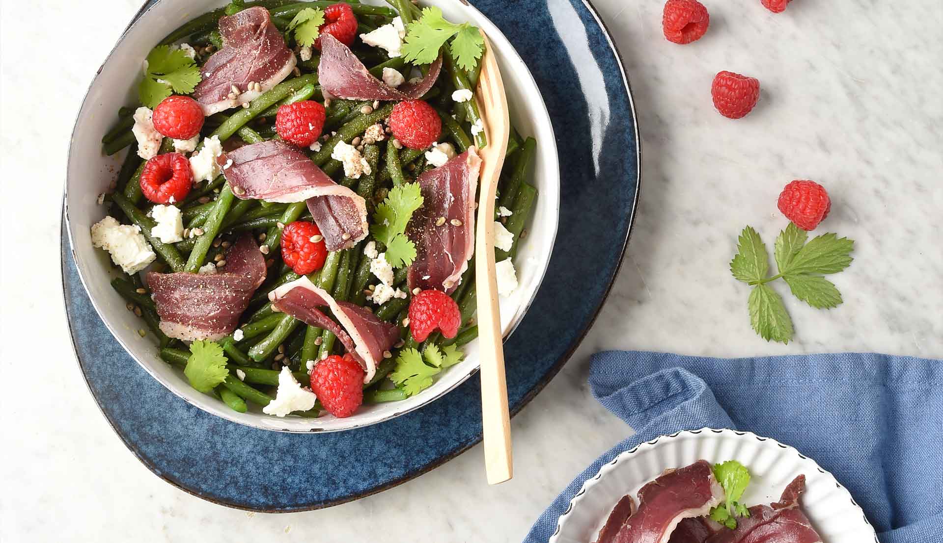 3. Disposez les haricots verts sur chaque assiette, ajoutez les tomates cerise. Emiettez la feta et disposez les olives. Ajoutez les tranches de magret fumé et saupoudrez de graines de lin.